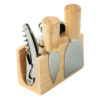 Блок с принадлежностями для сыра и вина легко можно снять при необходимости, ведь он крепится к доске при помощи магнитов. Ножи фиксируются к широкой грани этого блока при помощи магнитов, штопор — на узкой, ему отведена отдельная вырубленная ниша, что обеспечивает быстрый и удобный доступ к этим инструментам и предотвращает ржавение благодаря конструкции держателей. Для кольца и пробки предусмотрены вырубленные по форме каждого из приспособлений пазы, причем кольцо тоже имеет фиксирующий магнит.