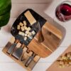 Этот роскошный набор для сыра идеально подходит на роль подарка для любого торжественного случая. Набор изготовлен из черного мрамора и акации: каменная вставка на крышке выполняет не только декоративную, но и практическую функцию, ведь на ней очень удобно резать и раскладывать сыр. Инструменты для резки сыра хранятся в выдвижном ящике под крышкой, для каждого из приспособлений предусмотрена своя вырубленная ниша. Из-за особенностей материала возможны вариации рисунка мрамора и дерева, что может отразиться на выгравированном изображении.
