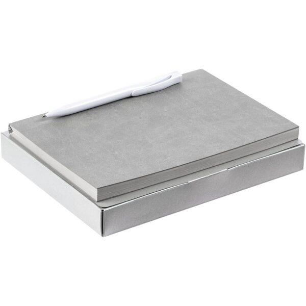 Компактный набор со стильным ежедневником в гибкой обложке с покрытием софт-тач и подходящей ручкой. Все составляющие сложены в самосборную коробку, которая придает набору законченность.