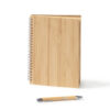 Блокнот и ручка из бамбука формата А5. Блокнот с твердой обложкой и 80 разлинованными листами из переработанной бумаги. Шариковая ручка с хромированными деталями и синими чернилами.