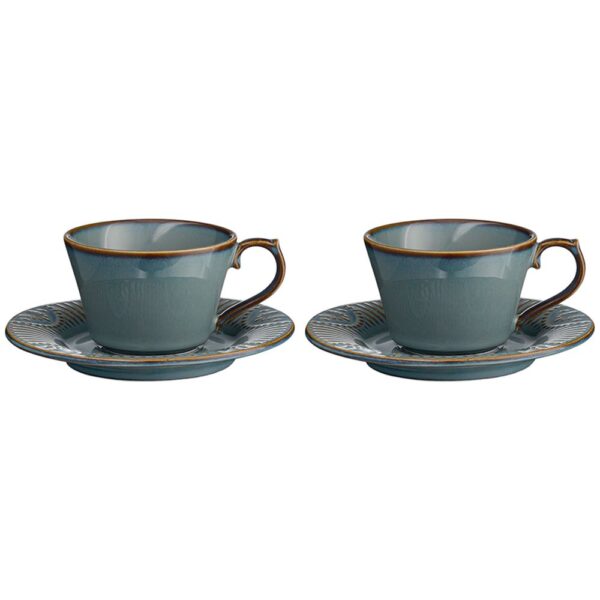 Набор чайных пар в элегантном дизайне украсит стол и разнообразит сервировку. Чашки и блюдца выполнены из высококачественного фарфора и покрыты реактивной глазурью, благодаря которой изделия приобретают неповторимую текстуру.
