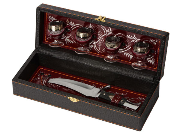 Шкатулка-футляр - хороший подарок, особенно, если в ней достойное содержание. Например, набор рюмок на 4 персоны и нож для закуски. Отдельно такой набор дарить не солидно - не красиво преподносить стопки без упаковки, а пустая шкатулка только разочарует - открывая такую красоту, всегда ждешь внутри что-то чудесное.