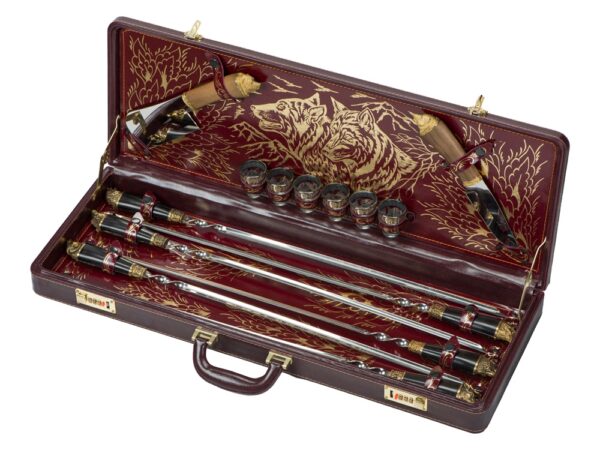 - Шампура (нерж.сталь 3,5 х 2,5 х 67 см), рукоять орех с бронзовым литьем – 6 шт.