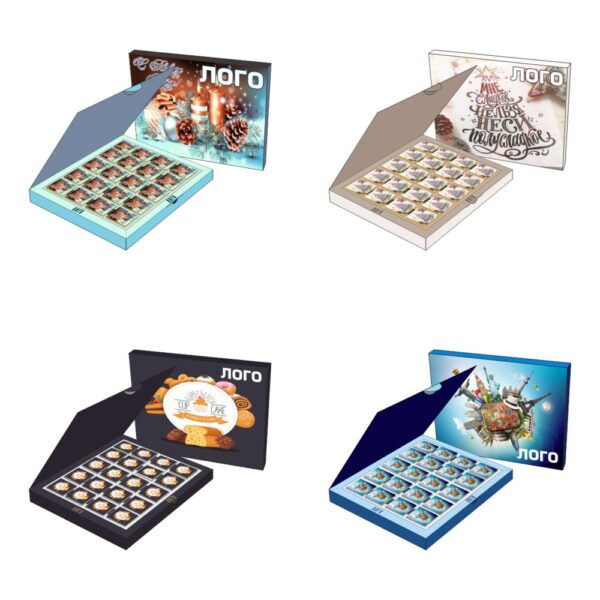 Набор из 20 плиток шоколада в коробке из картона с закрывающейся крышкой.