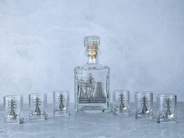 Подарочный набор со штофом «Энергетики». Традиционная для русского человека комплектация: элегантный графин емкостью 700 мл. с оловянным барельефом «ЭНЕРГЕТИК» и 6 стопок емкостью 50 мл. с оловянным барельефом «Опора ЛЭП». Материал барельефов: сплав с содержанием олова не менее 95%(пьютер). Художественное литье,чернение с эффектом антикварного серебра,полировка. Ручная работа. Подарочная упаковка «люкс» с атласным ложементом синего цвета.
