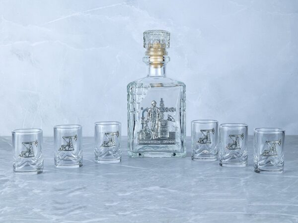 Подарочный набор со штофом «Нефтяной». Традиционная для русского человека комплектация: элегантный графин емкостью 750 мл. с оловянным барельефом «Нефтяник» и 6 стопок емкостью 50 мл. с оловянным барельефом «Нефтяная вышка». Материал барельефов: сплав с содержанием олова не менее 95%(пьютер). Художественное литье,чернение с эффектом антикварного серебра,полировка. Ручная работа. Подарочная упаковка «люкс» с атласным ложементом синего цвета.