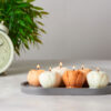 В наборе три белых свечи со сладким ароматом французской ванили, две персиковых с согревающими и укутывающими нотками перца, нероли и амбры и одна темно-персиковая, обладающая свежим и успокаивающим запахом лаванды. Это позволяет выбрать аромат под настроение.