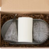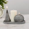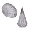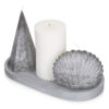 Лаконичная геометрия, сочетающаяся с природным дизайном ракушки, натуральные молочный и неоднородный серый оттенки и подставка из гипсобетона смотрятся естественно, стильно и ненавязчиво.
