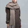 Широкий палантин с едва заметным узором плетения открывает простор фантазии — его можно использовать как шарф, головной убор или декоративный элемент для верхней одежды.