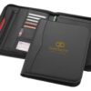Папка с застежкой-молнией, держателем для пучки, карманом на молнии, отделениями для документов и блокнотом А4 с 20 страницами линованной бумаги. Ручка и принадлежности не включены.