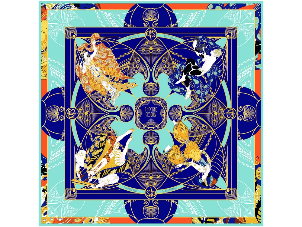 В дизайне платка «Русские сезоны. Лев Бакст» мы воспроизвели эскизы костюмов к таким балетным спектаклям как «Клеопатра», «Шехерезада» и «Послеполуденный сон Фавна», поражающие зрителей своей фантазией, сказочной роскошью, утонченной изысканностью линий, новыми и смелыми сочетаниями красок.