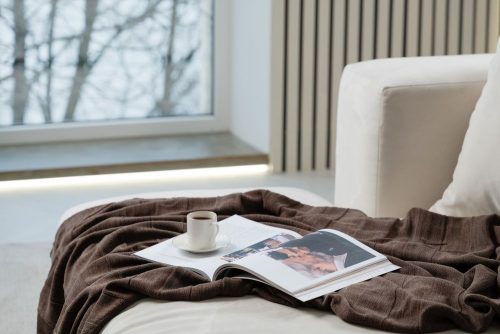 Минималистичный плед фактурной вязки из меланжевой пряжи.