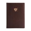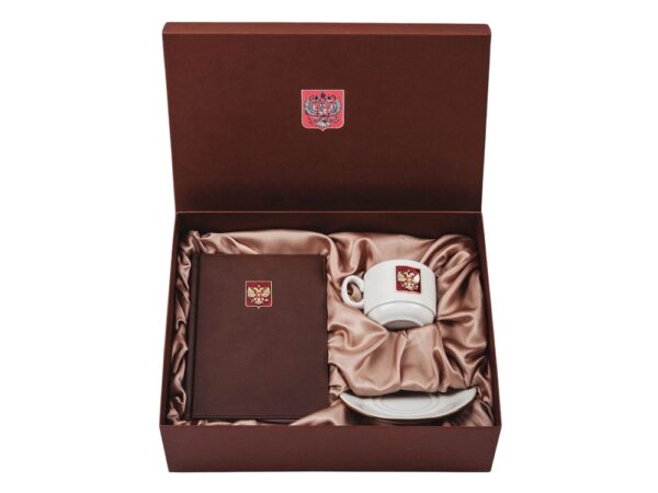Ежедневник формата А5 с декором "Герб РФ на щите" и фарфоровая чайная пара с золотой отводкой края чашки и блюдца декорированная металлическим барельефом "Двуглавый орел".