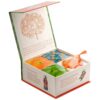 Продукты упакованы в небольшие картонные коробочки размером 70 х 70 х 55 мм и помещены в шкатулку из переплётного картона с магнитным клапаном.