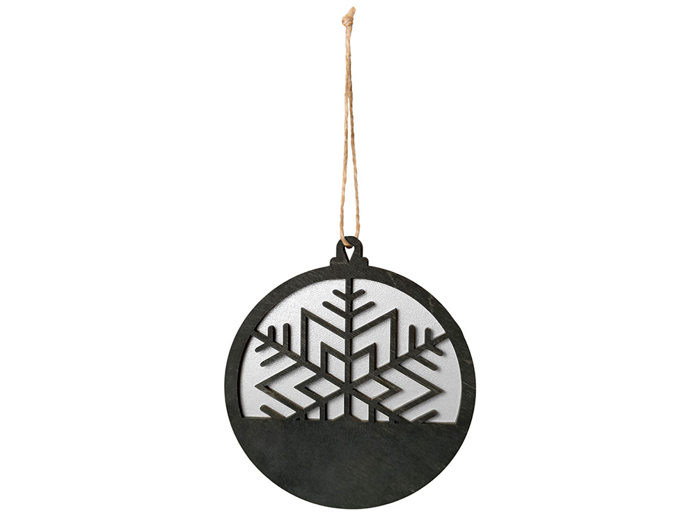 Стильная и минималистичная подвеска в форме снежинки выполнена из натуральной березовой фанеры. Сочетание черного и серебристого оттенков создаёт ощущение зимнего холода и утончённой простоты.