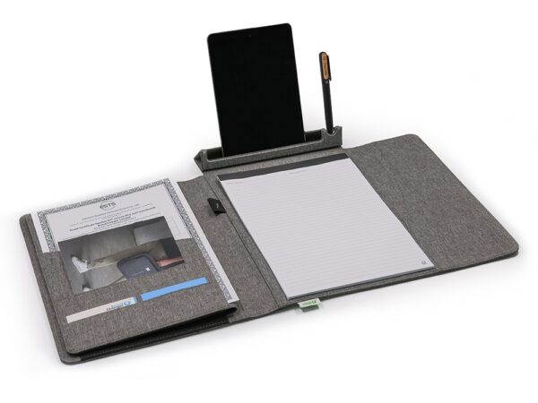 Обложка выполнена из переработанного пластика (RPET). Внутри папки 20 листов FSC бумаги плотностью 80 г/м2, изготовленной с соблюдением экологических норм.