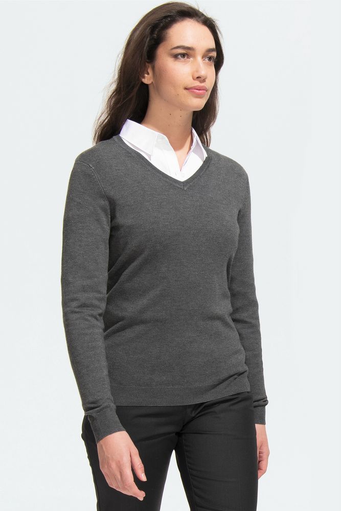 Приталенный джемпер с V-образной горловиной, который отлично сидит на фигуре.
