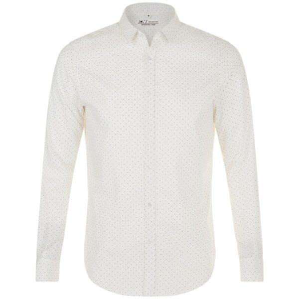 Модная рубашка с печатным рисунком в горошек, которая прекрасно впишется в современный корпоративный стиль.Облегающая модель с маленьким классическим воротничком, планкой с 7 пуговицами тон в тон и манжетами на 1 пуговице с разрезом «капуцин».