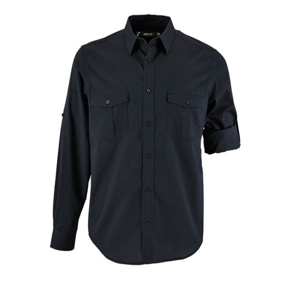 Рубашка прямого кроя в стиле «сафари» с планкой на 7 пуговиц в тон и манжетами на 1 пуговице. Накладные карманы с клапанами на пуговицах на груди. Длина рукава регулируется.