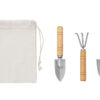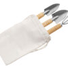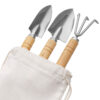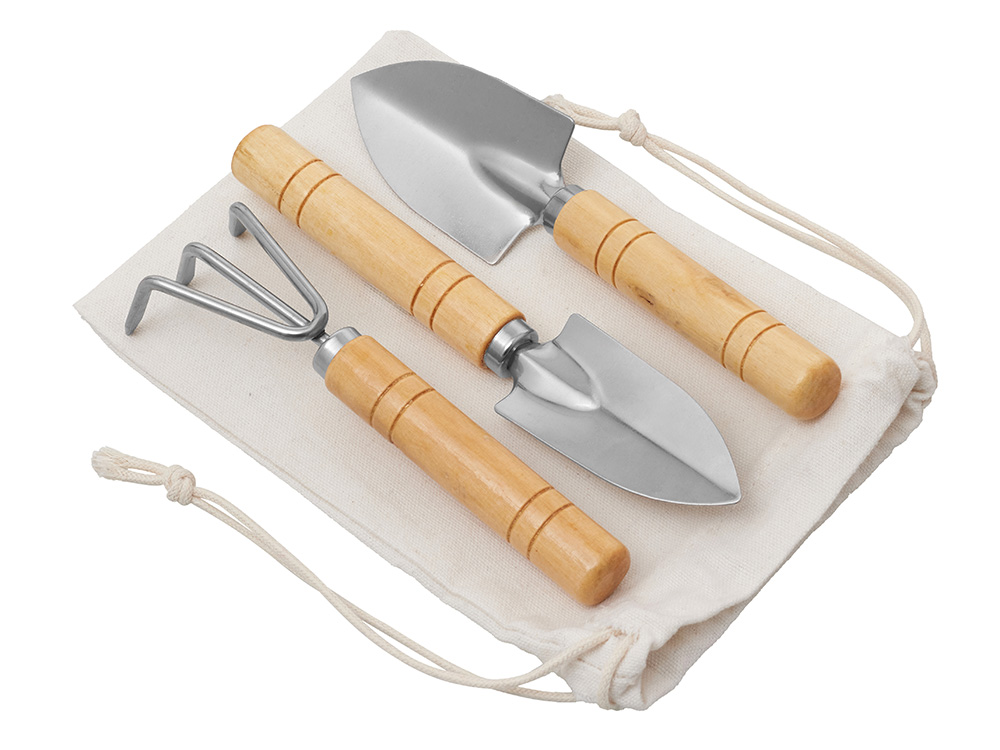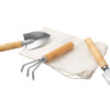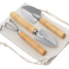 Садовый набор из 3 аксессуаров из нержавеющей стали с бамбуковыми ручками. Включает большую и малую лопатки и грабли. В комплект входит хлопковый мешочек.