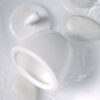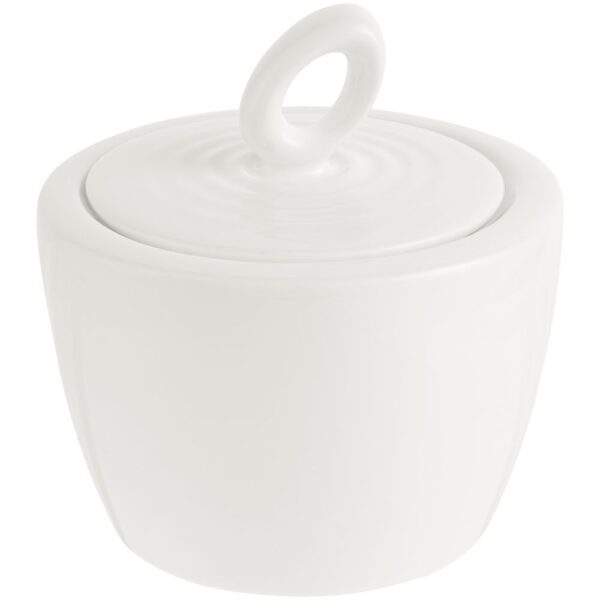 Крышка сахарницы создана в скульптурной технике: фарфор словно запечатлел сам момент движения. Необычная ручка предметов символизирует камень, от которого появляются завораживающие круги на воде.