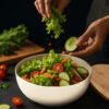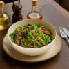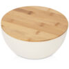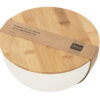 Круглый салатник с бамбуковой крышкой изготовлен на 80% из натуральных материалов. Он подходит для сервировки как лёгких салатов из свежих овощей, так и для более сытных и праздничных.
