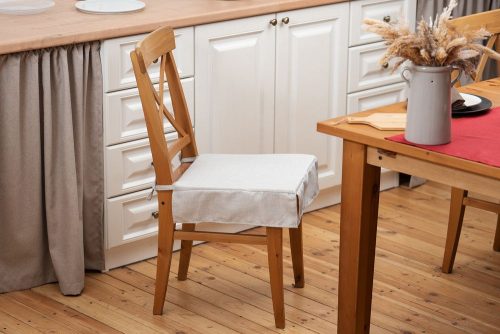 Поролон внутри подушки делает сидение мягче, а спускающиеся по сторонам клапаны сразу придают стулу более элегантный вид. Износостойкая ткань, имитирующая лен, обработана пропиткой от грязи и воды, что делает ее применение для кухни и дома практичным, а уход — легким.
