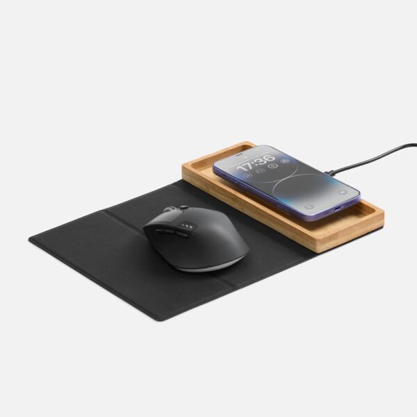 Midstream — это коврик для мышки с площадкой для беспроводной зарядки и отсеком для канцелярских принадлежностей. Его можно использовать как на работе, так и в дороге или на встречах: коврик компактно складывается и не занимает много места в сумке для ноутбука.