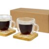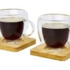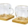 Набор из 2 термостаканов с двойными стенками и бамбуковой подставкой. Бамбук поставляется из устойчивых, экологически и социально ответственных источников. Благодаря двойному боросиликатному стеклу температура напитка сохраняется в течение длительного времени. Объем 100 мл. Размер подставки: 8 x 8 x 1 см.