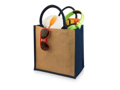 Джутовая подарочная сумка Chennai. Джутовая сумка с ламинированным открытым основным отделением и вставкой. Хлопковые ручки высотой 11,5 см. Джут. Термотрансфер (1 цвет (цветные изделия)) на данный товар осуществляется бесплатно. Оплачивается только настройка оборудования в размере 9200 рублей на весь тираж.