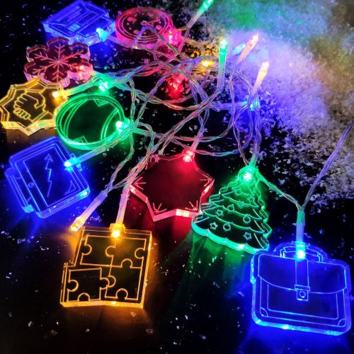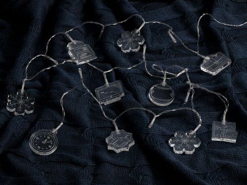 Гирлянда состоит из 20 разноцветных светодиодов и 10 акриловых фигурок.