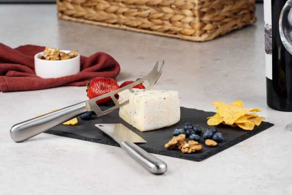 Выполненная из сланца доска идеальна для подачи закусок.В комплекте сланцевая доска, нож-топорик для твердых сортов сыра, нож для сыров средней мягкости.