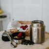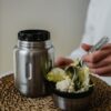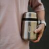 Стальной вакуумный термос для еды со складной ложкой. В нем любимые блюда не соприкасаются с пластиком и остаются горячими надолго.