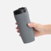 Двухслойная конструкция из нержавеющей стали снаружи и пищевого пластика внутри. Герметичная завинчивающаяся крышка с откидным клапаном для питья. Покрытие софт-тач. В отверстие в крышке можно вставить шнурок для удобного ношения стакана на руке. Шнурок в комплект не входит.