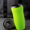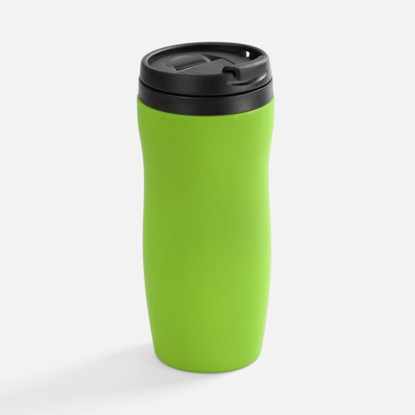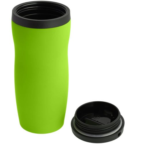 Двухслойная конструкция из нержавеющей стали снаружи и пищевого пластика внутри. Герметичная завинчивающаяся крышка с откидным клапаном для питья. Покрытие софт-тач. В отверстие в крышке можно вставить шнурок для удобного ношения стакана на руке. Шнурок в комплект не входит.