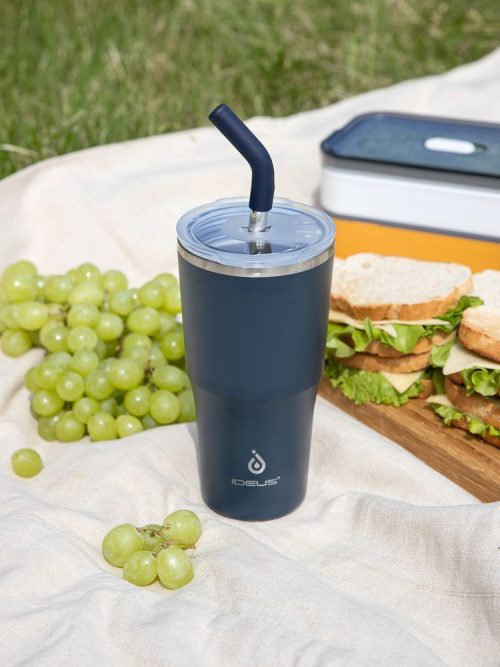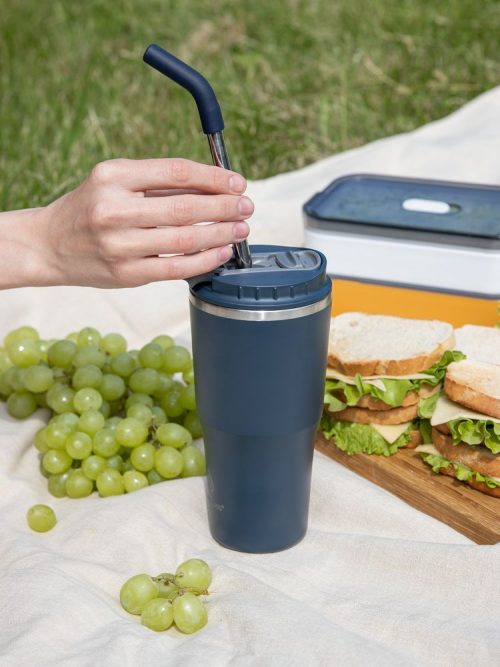 • 2 крышки в комплекте: одна на 100% герметичная с механизмом блокировки отверстия для питья, вторая — с отверстием для трубочки