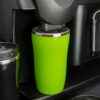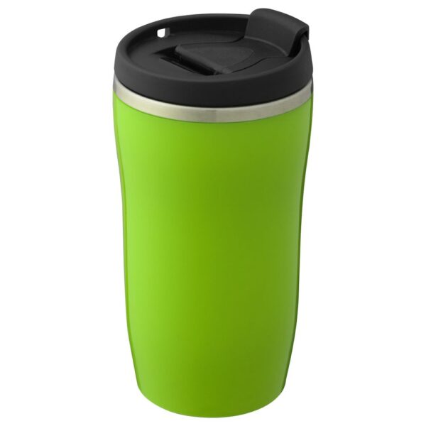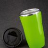 Двухслойная конструкция из пластика снаружи и пищевой нержавеющей стали внутри. Герметичная завинчивающаяся крышка с откидным клапаном для питья. В отверстие в крышке можно вставить шнурок для удобного ношения стакана на руке. Шнурок в комплект не входит.