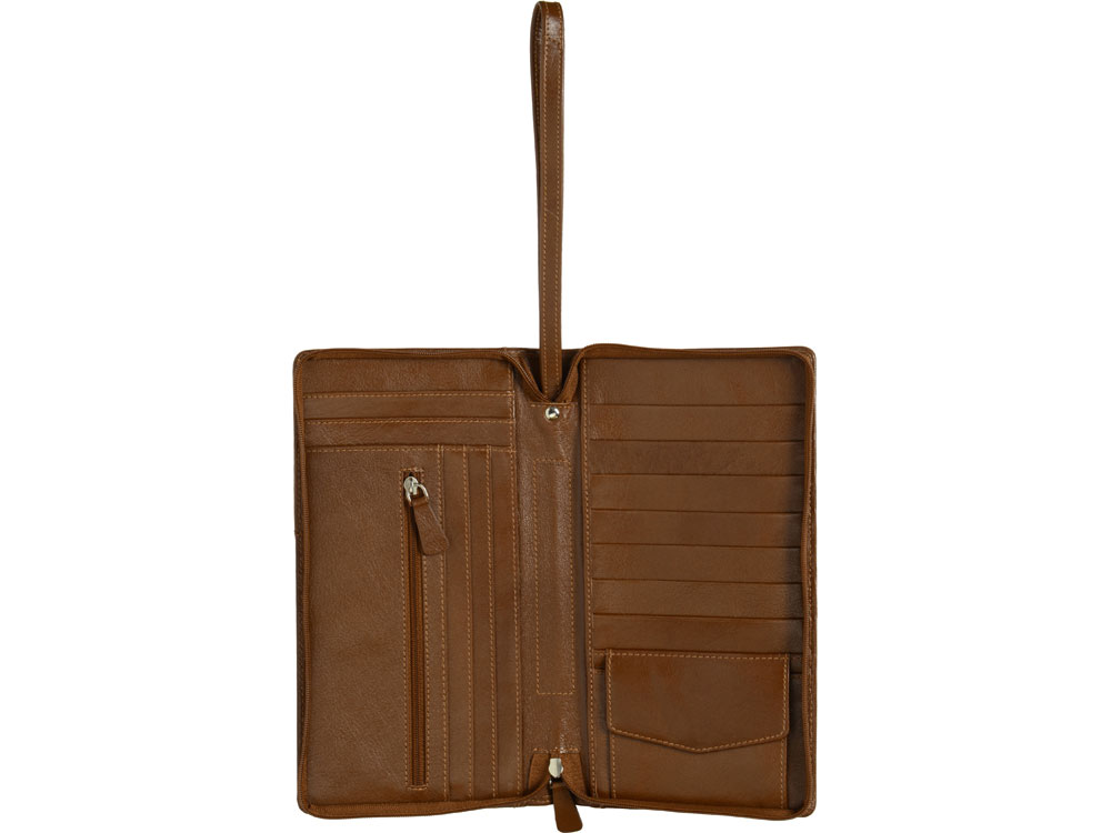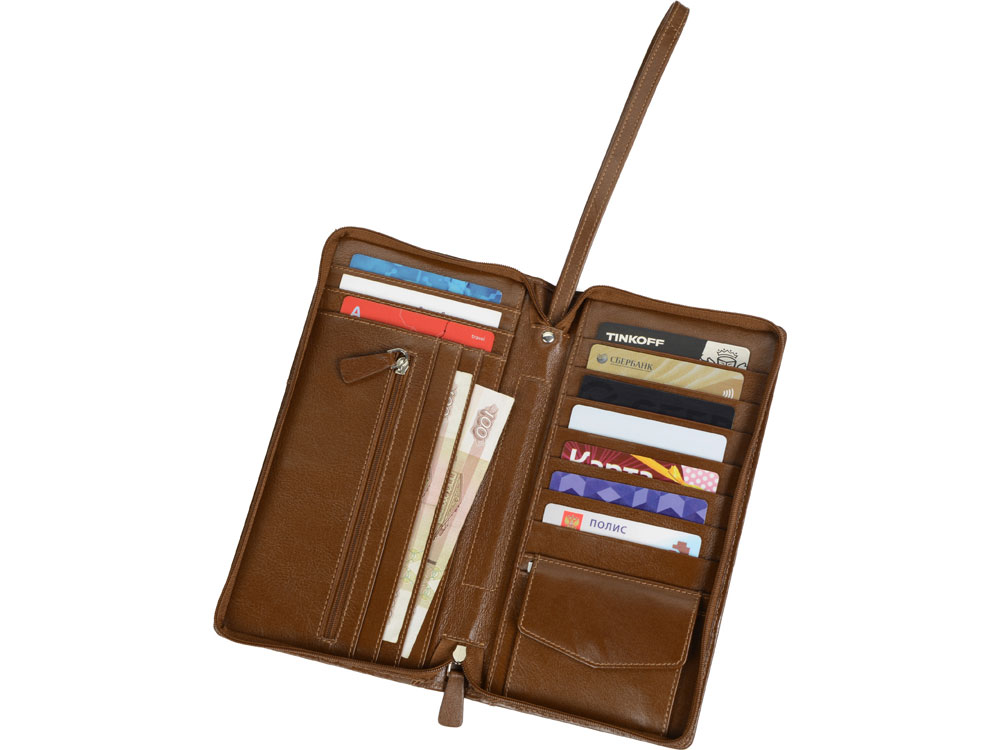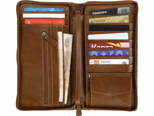 Стильное трэвел-портмоне из натуральной кожи позволит организоват хранение визитных и пластиковых карт. В портмоне предусмотрены карманы под купюры. Портмоне прекрасно подойдет для подарка женщинам и мужчинам. Тиснение (Блинт) на данный товар осуществляется бесплатно. Оплачивается только настройка оборудования в размере 6200 рублей на весь тираж.
