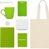 шоппер- 100% хлопок, блокнот и чехол- искусственная кожа, ручка и держатель- пластик, кружка- керамика, ланъярд- RPET, открытка- бумага
