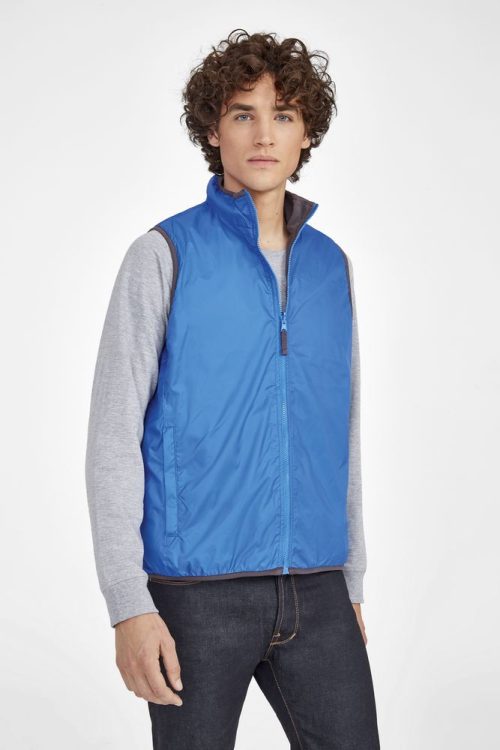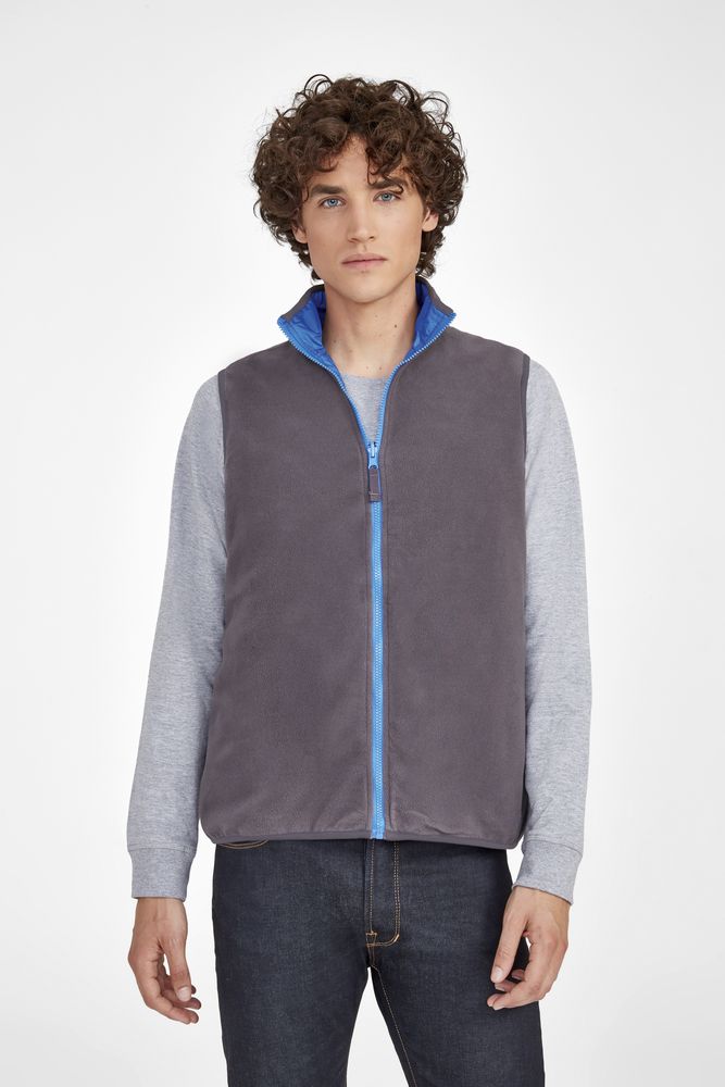 Сверху нейлон с водостойкой пропиткой, внутри — флис. А можно и наоборот. Жилет ведь двусторонний. Для удобства нанесения логотипа можно частично отстегнуть подкладку.