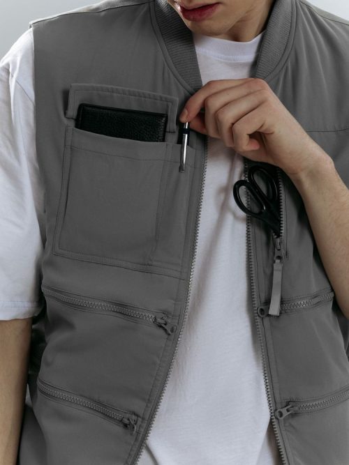 • 8 функциональных карманов, из них на передней части: 1 карман с клапаном для документов/рации, 1 карман для ручки, 5 вместительных на молнии, а так же 1 карман под планшет на молнии на спинке жилета