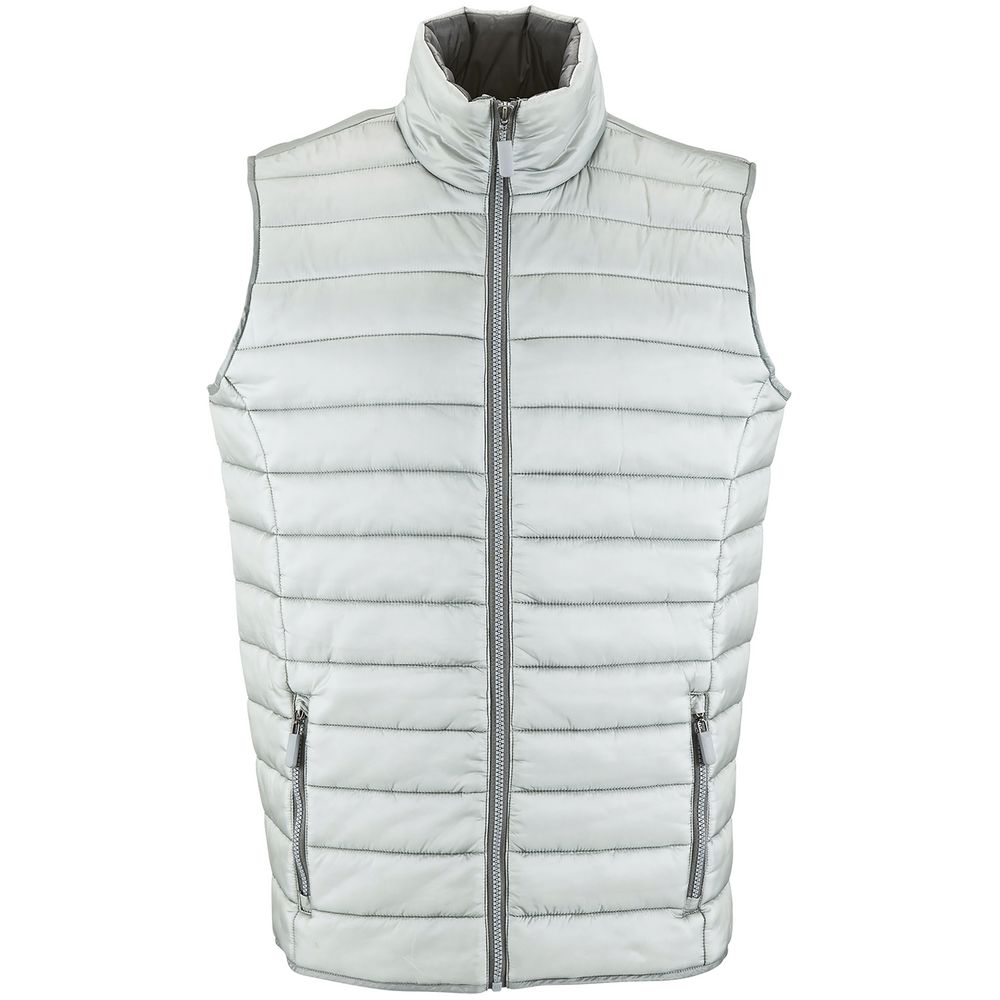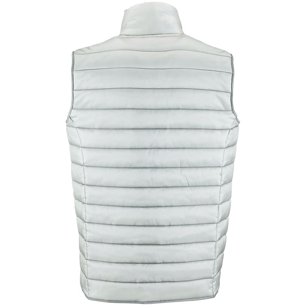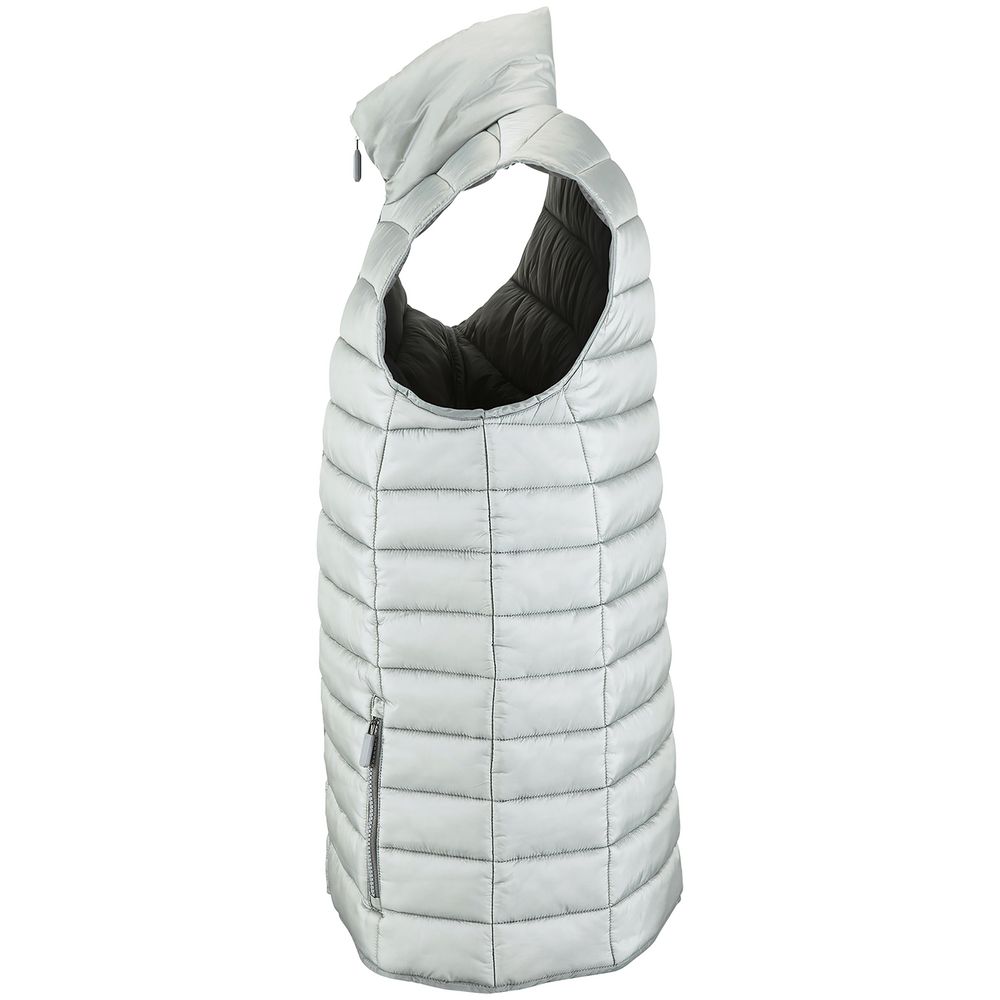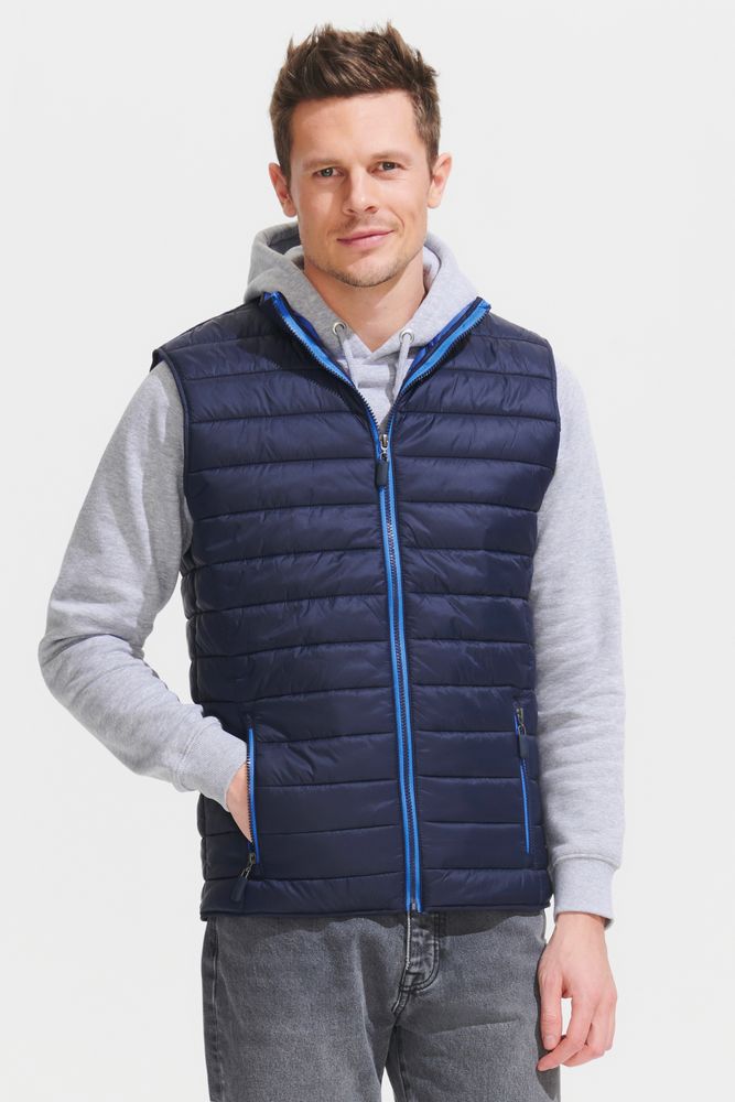 Приталенная модель, воротник-стойка. Застежка-молния в цвет жилета, два боковых кармана на молнии в цвет подкладки, окантовка по низу жилета тон в тон.