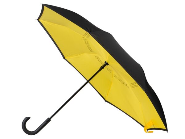 Зонт с обратным сложением складывается "внутрь". Очень удобен в использовании, например, во время посадки в машину при складывании вода остается внутри купола. Для просушки зонт можно поставить вертикально на пол в сложенном виде, что позволяет воде стекать без раскрытия зонта. Двойной купол из 190Т эпонжа. Ручка с мягким покрытием soft-touch для большего комфорта.